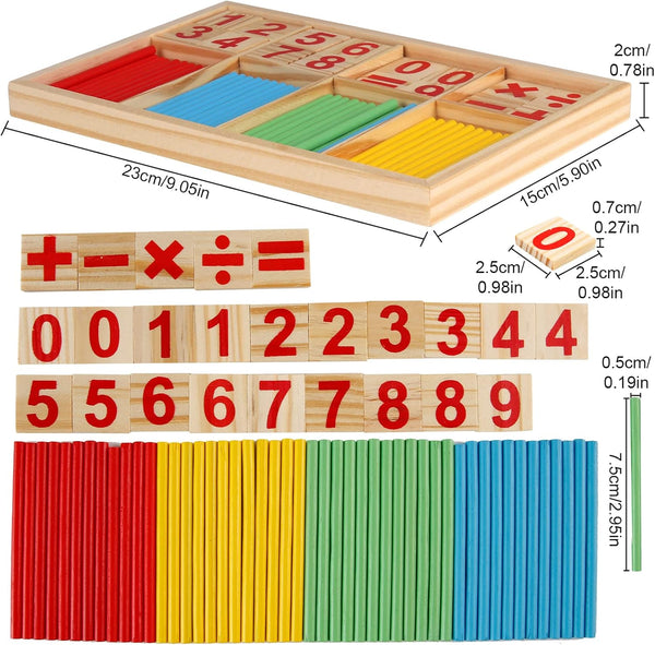 Das Set enthält Zählstäbchen, Zahlenkarten und Mathezeichen für umfassendes Lernen.